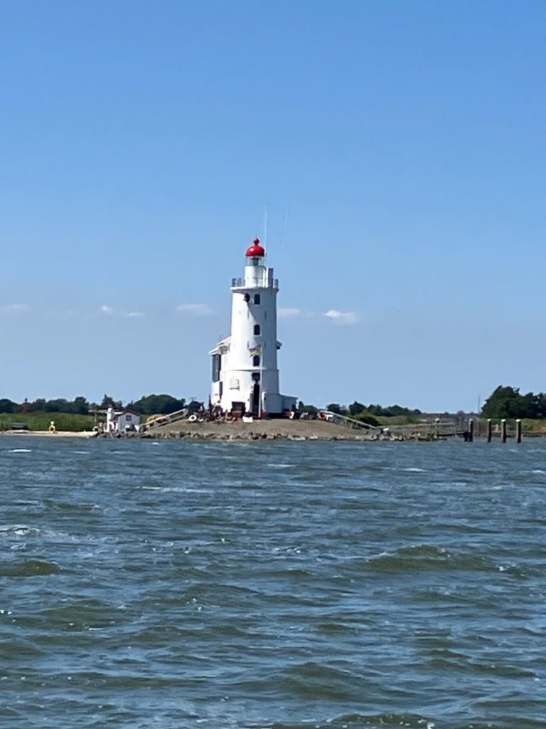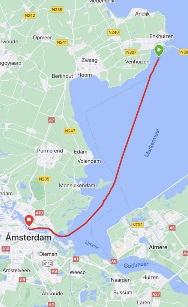 Einmal raus aus dem Hafen steuern wir die Schleuse an, um durch den Deich zu kommen, der das Ijsselmeer vom Markermeer trennt. Dann geht es mit sehr wenig Wind Richtung Amsterdam. Als der Wind ein klein wenig auffrischt, setzen wir das Groß und die Fock, aber nach zwei Meilen nur mit Windkraft müssen wir den Motor wieder starten. Es gibt kaum Wind.