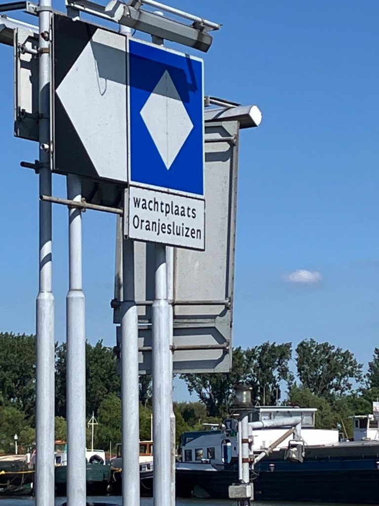 Anschließend geht es in die Wartezone für die Oranje-Schleuse. Hier dauert es etwas länger, bis wir hineindürfen. Drinnen sprechen wir mit dem sehr freundlichen Schleusenwärter. Er nennt die beiden Häfen, die er für empfehlenswert hält: Sixhaven gegenüber der Centraal Station (Hauptbahnhof), klein und ziemlich voll, aber sehr schön, und Amsterdam Marina, unwesentlich weiter, größer und moderner, aber nicht ganz so schön.