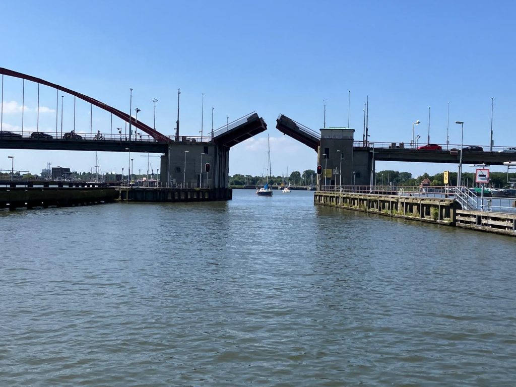 Richtung Amsterdam nimmt der Verkehr zu. Frachtschiffe überholen uns. Wir nähern uns der Brücke, und mit einigen anderen Schiffen warten wir auf die Öffnung. Das ist in den Niederlanden immer wieder ein großartiges Spektakel.