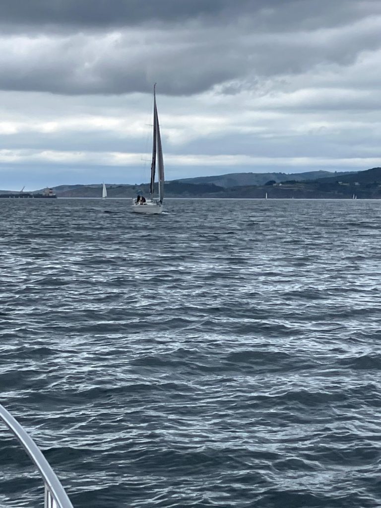 Die Ría ist lang, es dauert also etwas, über 20 Minuten sind wir schon unterwegs, als wir endlich noch ganz weit weg ein Segelboot mit dunklen Segeln sehen. Das müsste sie sein.