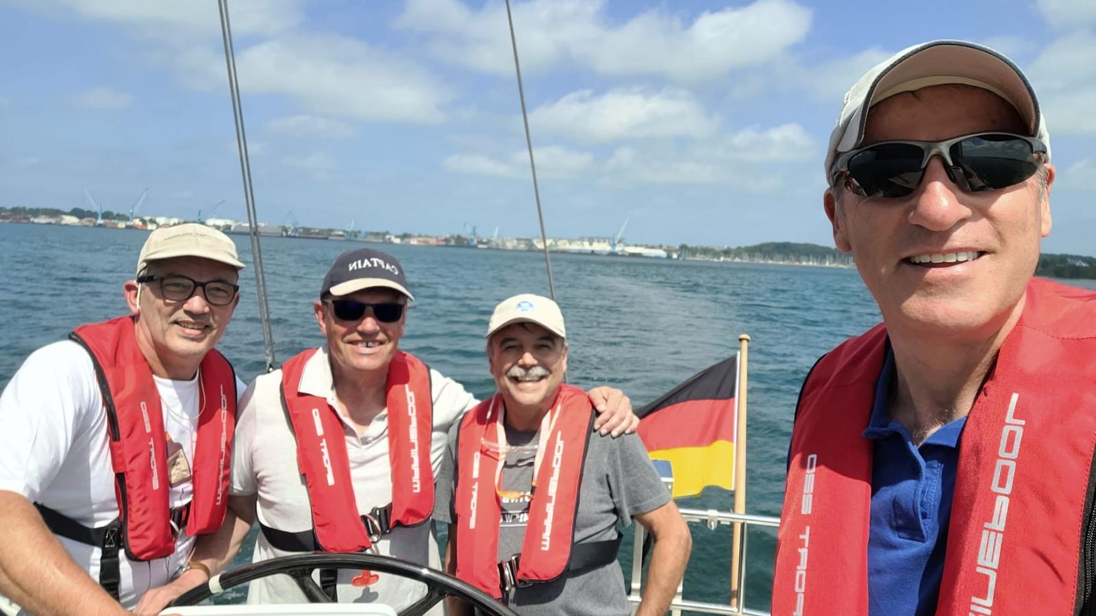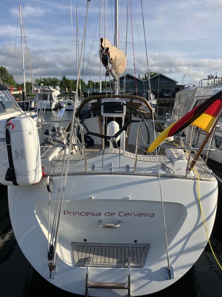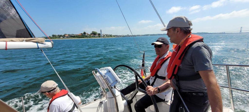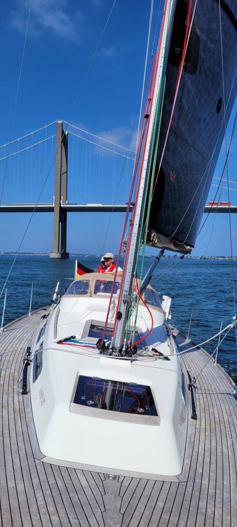 Die erste Ausfahrt: Im kleinen Belt führen wir das Schiff aus und bei wechselnden Winden bis 14 kn prüfen wir es 4 Stunden lang auf Herz und Nieren. Das Boot ist eine Wucht. Es gleitet durch das Wasser wie das berühmte heiße Messer durch die Butter, es reagiert perfekt auf jede Änderung im Kurs oder bei der Segelstellung. Ein seglerischer Traum, passend dazu ein Traumwetter. Allerdings gibt es doch ein paar Kleinigkeiten, die noch nachgearbeitet werden müssen.