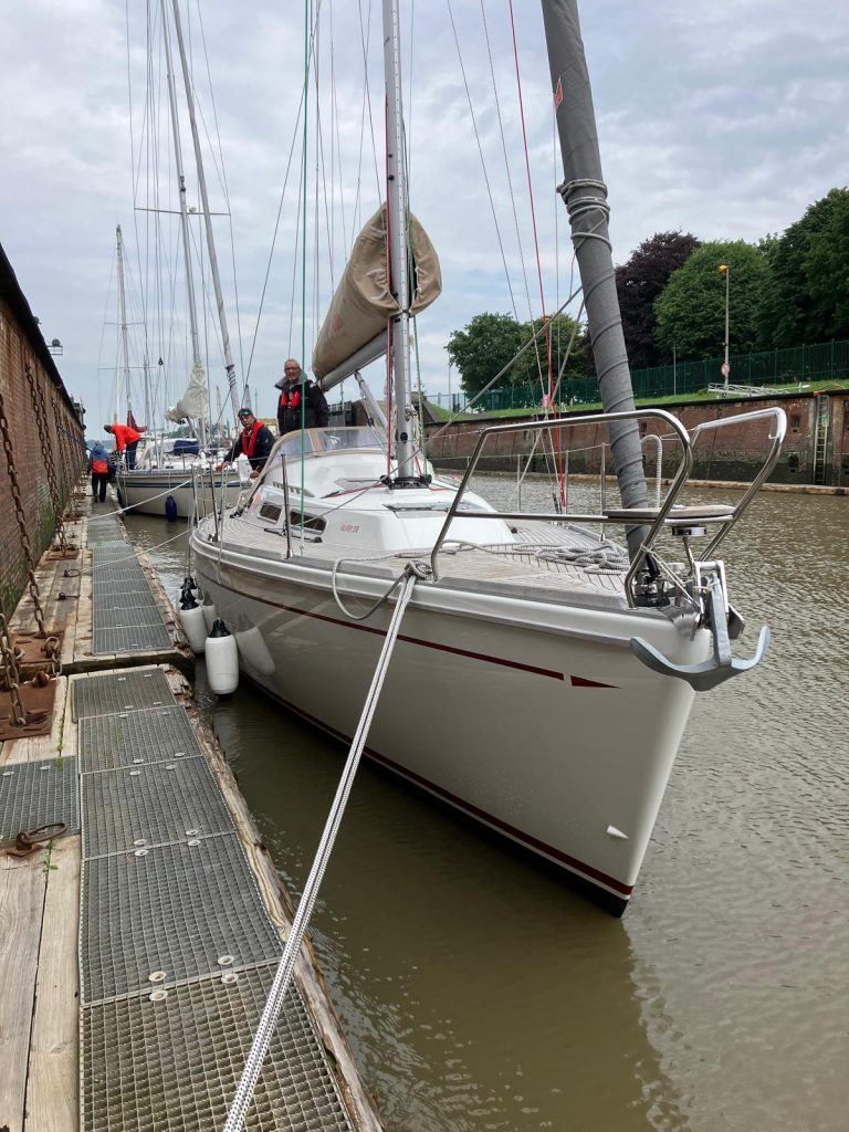 Anfangs haben wir kräftigen Strom von 2 Knoten gegenan. Im weiteren Verlauf kippt aber die Tide und dann geht es mit teilweise über 8 Knoten ab wie die Post. So erreichen wir Cuxhaven früher als erwartet. Um 17.30h ist das Boot so ordentlich vertäut, dass es hier nun die nächsten Wochen sicher liegen und auch Stürmen standhalten kann. Auch die nötige Wassertiefe ist mit mindestens 4 Metern bei Niedrigwasser gegeben. Schließlich soll der 2,10 m tiefe Kiel nicht auf den Grund kommen.